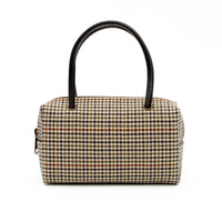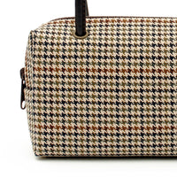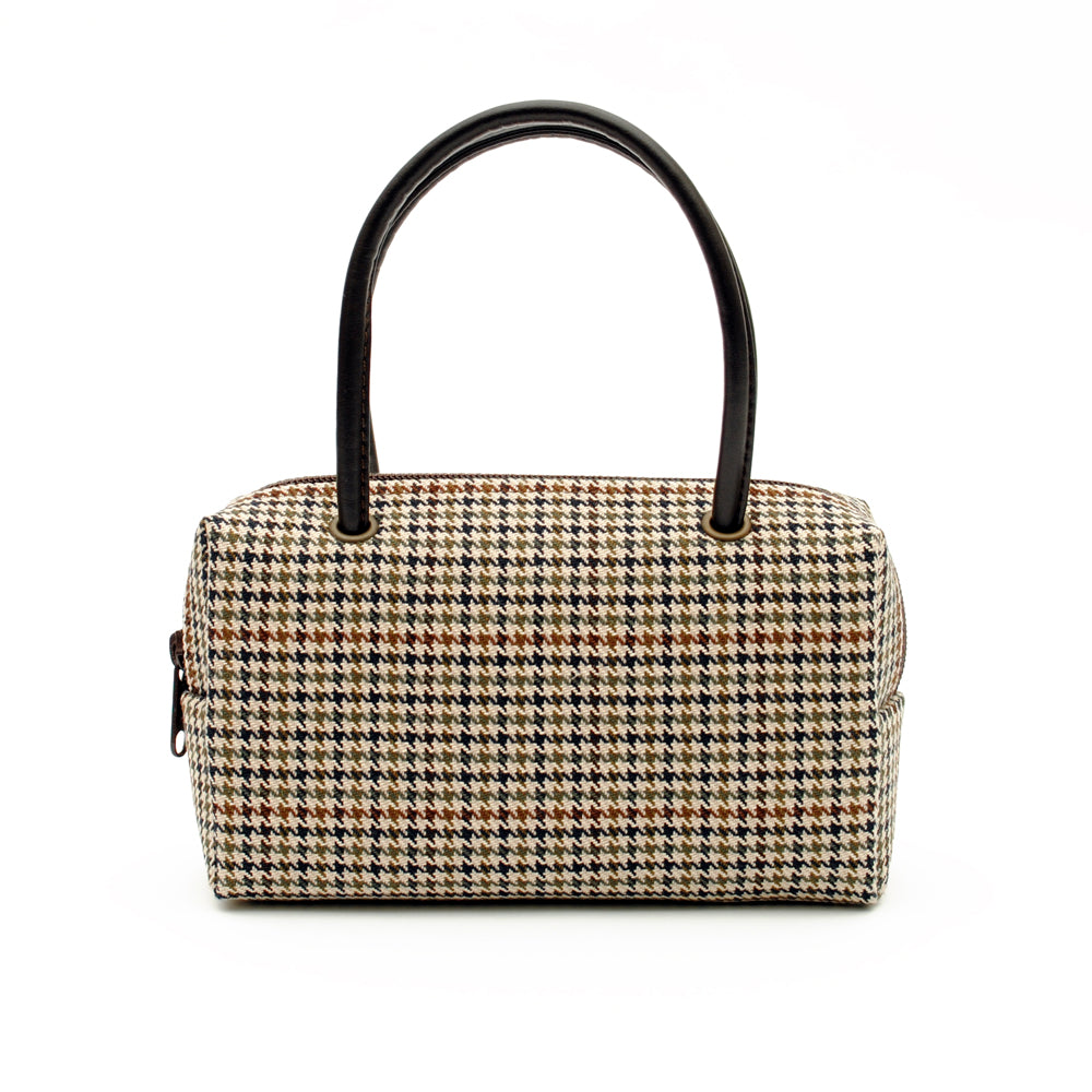 Handbag with zip closure and dark brown faux leather handles. Patterned lining. Interior phone sleeve. A fun bag to keep it all together.