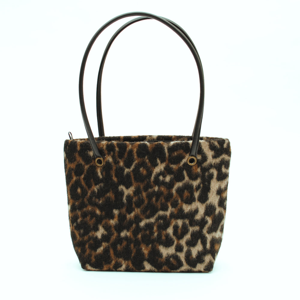Shoulder bag with zip closure and black faux leather handles. Patterned lining. Interior phone pocket. A simple little purse.
