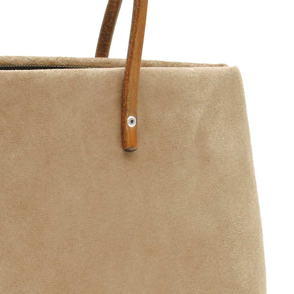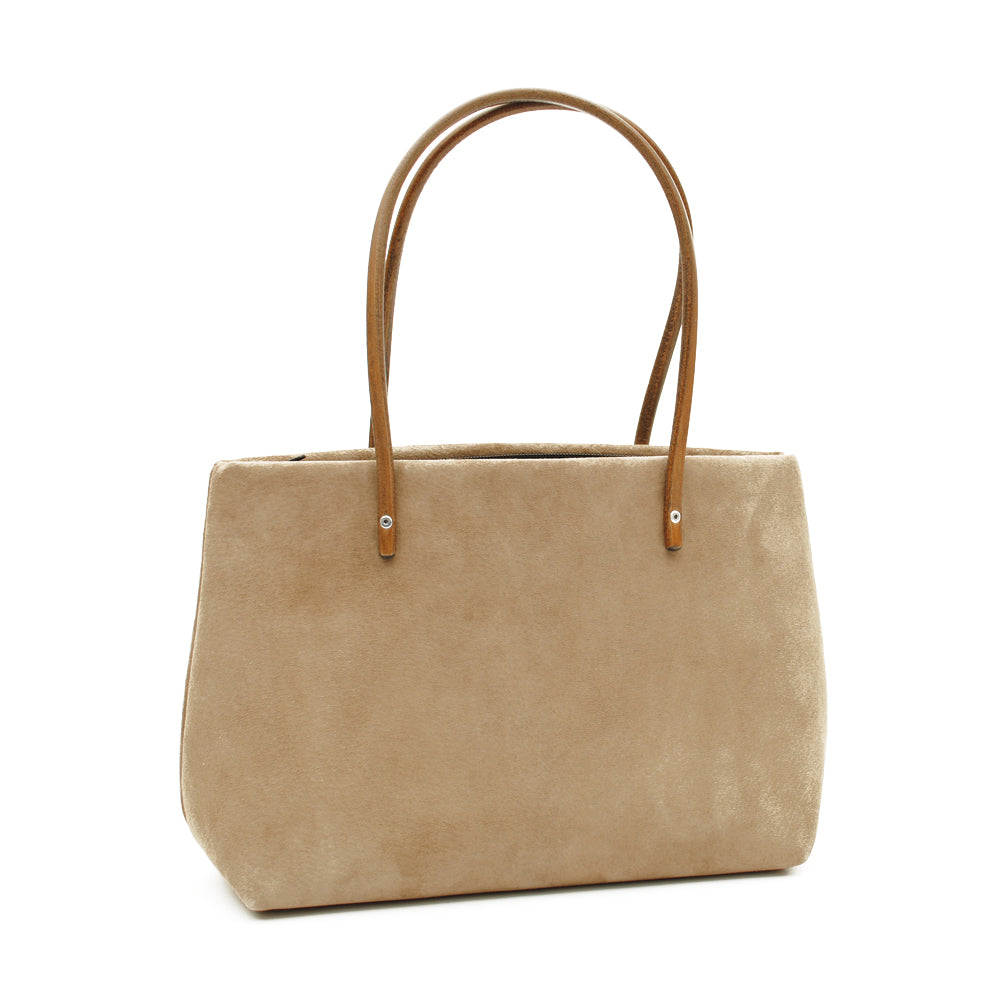 Shoulder bag with zip closure and natural leather handles. Patterned lining, an interior zipper pouch, and two gadget pockets. The perfect day bag. Just the right size and kind sexy.